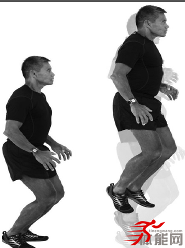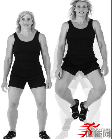 ?轻微耸肩助力原地起跳,双脚离地后保持弹性站姿。练习时,想象自己在试图摆脱地球引力,而不是向上跳跃。