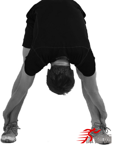 ?弯腰屈体,双手由外侧抓住双脚踝关节,尽量将头部伸向脚前地面。