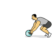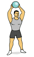 2. 双手持球,做出半蹲动作。用力伸展整个身体,从头上方向上、向后投球。